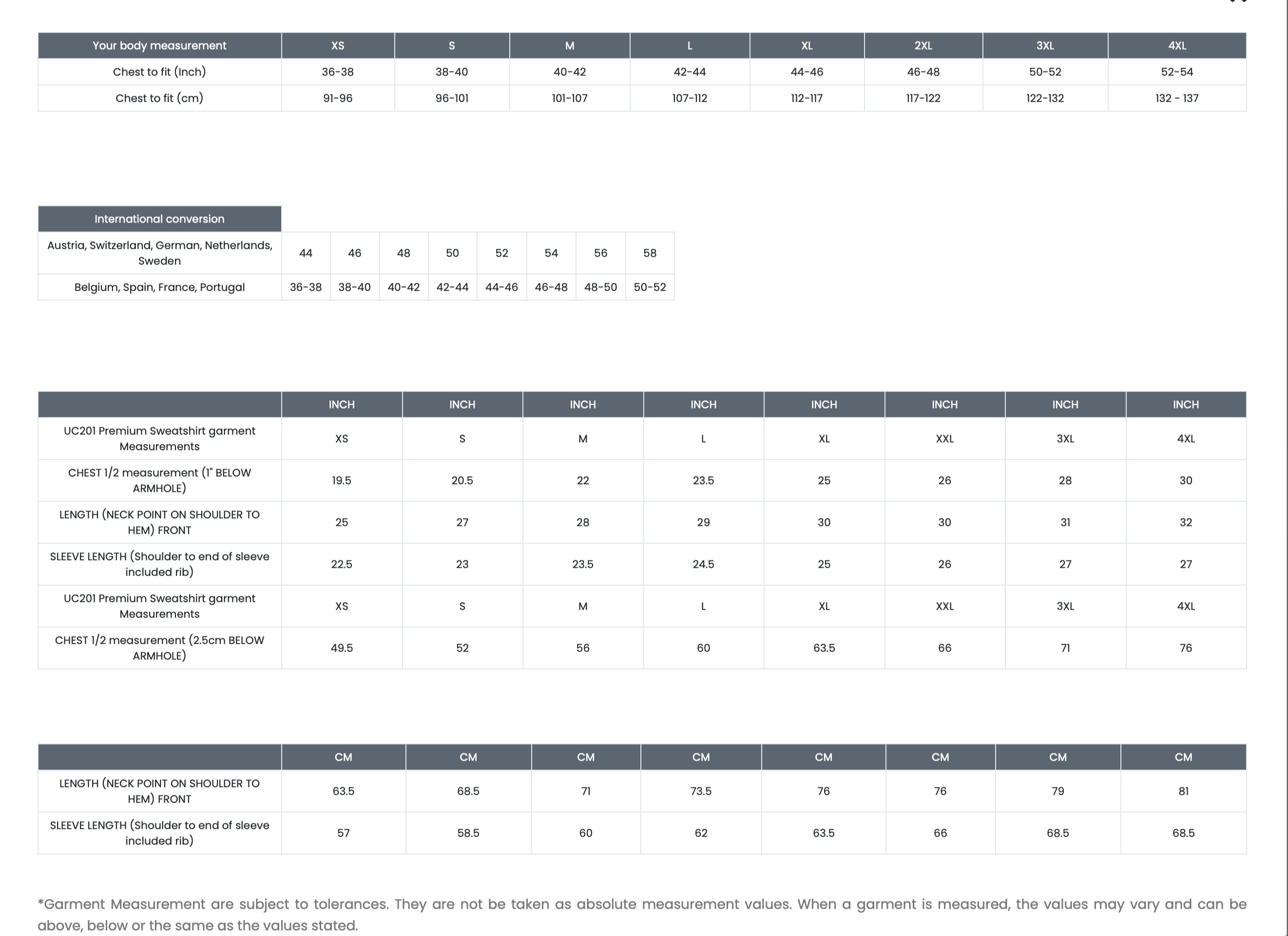 | Sleeve Length | 22.5 | 23 | 23.5 | 24.5 | 25 | 26 | 27 | 27 |